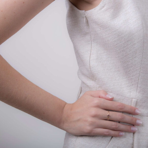 A Ametista, pedra de cor roxa escolhida para esse anel, é conhecida por fortalecer a intuição e o foco.