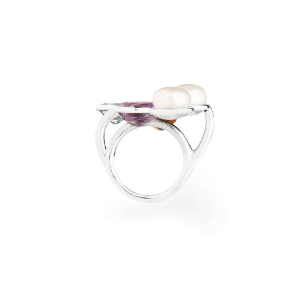 A Coleção Nature Divine faz referência às formas orgânicas da natureza. Assim como o ramo de uma árvore sustenta flores e frutos, as curvas inusitadas desse anel revelam pérolas e pedras em um design único e excepcional. As pérolas brancas e pedras brasileiras formam uma paleta de cores alegre e sofisticada. Peça 100% feita à mão, do design ao acabamento.