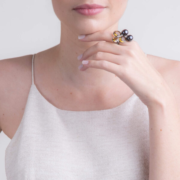 Anel Pérolas Negras e Quartzo Whisky Prata de Lei