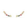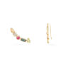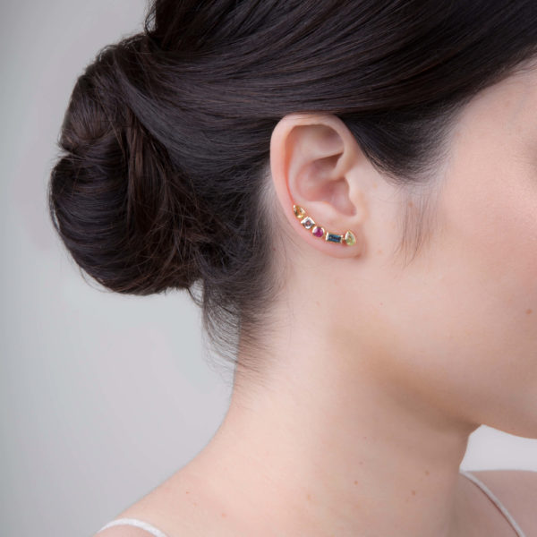 Esse brinco veste de forma anatômica, seguindo o formato da orelha. Conta com as seguintes pedras, cada qual conhecida por um tipo de benefício: Citrino – amarelo dourado (autoconfiança e prosperidade), Turmalina rosa (amor próprio e harmonização dos relacionamentos), Peridoto – verde vivo (propósito de vida), Topázio London – azul marinho e Topázio Branco – transparente (detox do organismo e clareza mental).