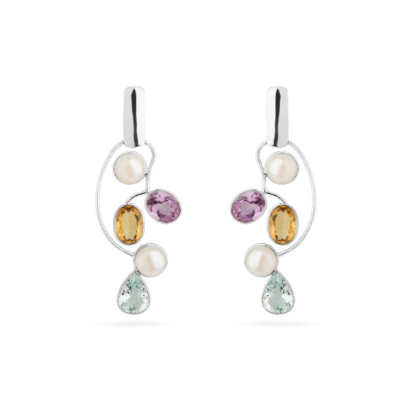 A Coleção Nature Divine faz referência às formas orgânicas da natureza. Assim como o ramo de uma árvore sustenta flores e frutos, as curvas inusitadas desse brinco revelam pérolas e pedras em um design único e excepcional. As pérolas brancas e pedras brasileiras formam uma paleta de cores alegre e sofisticada. Peça 100% feita à mão, do design ao acabamento.